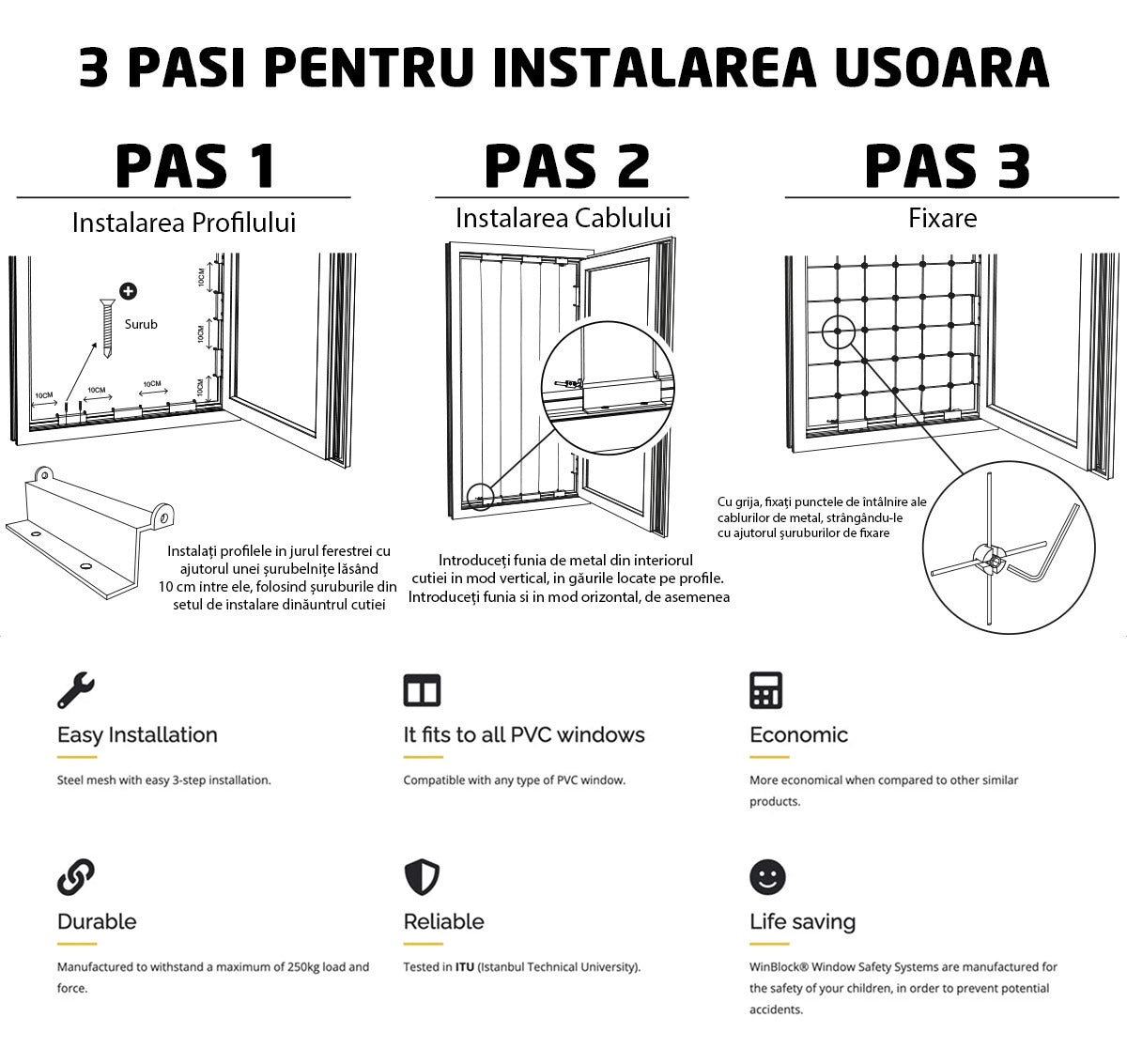1. Usurinta in instalare. Se instaleaza de sinestatator in doar 3 pasi. Video cu instructiuni de montaj, cu explicatii pas cu pas, gasiti pe pagina principala